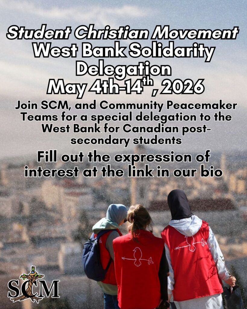 This May, SCM is sponsoring a delegation of students/young adults to travel to the West Bank in collaboration with Community Peacemaker Teams Canada/Palestine. Participants will spend ten days meeting and learning from local community makers, experiencing the reality of life in occupied Palestine, and participating in non-violent solidarity actions. CPT has extensive experience in running these delegations in a meaningful and safe way.